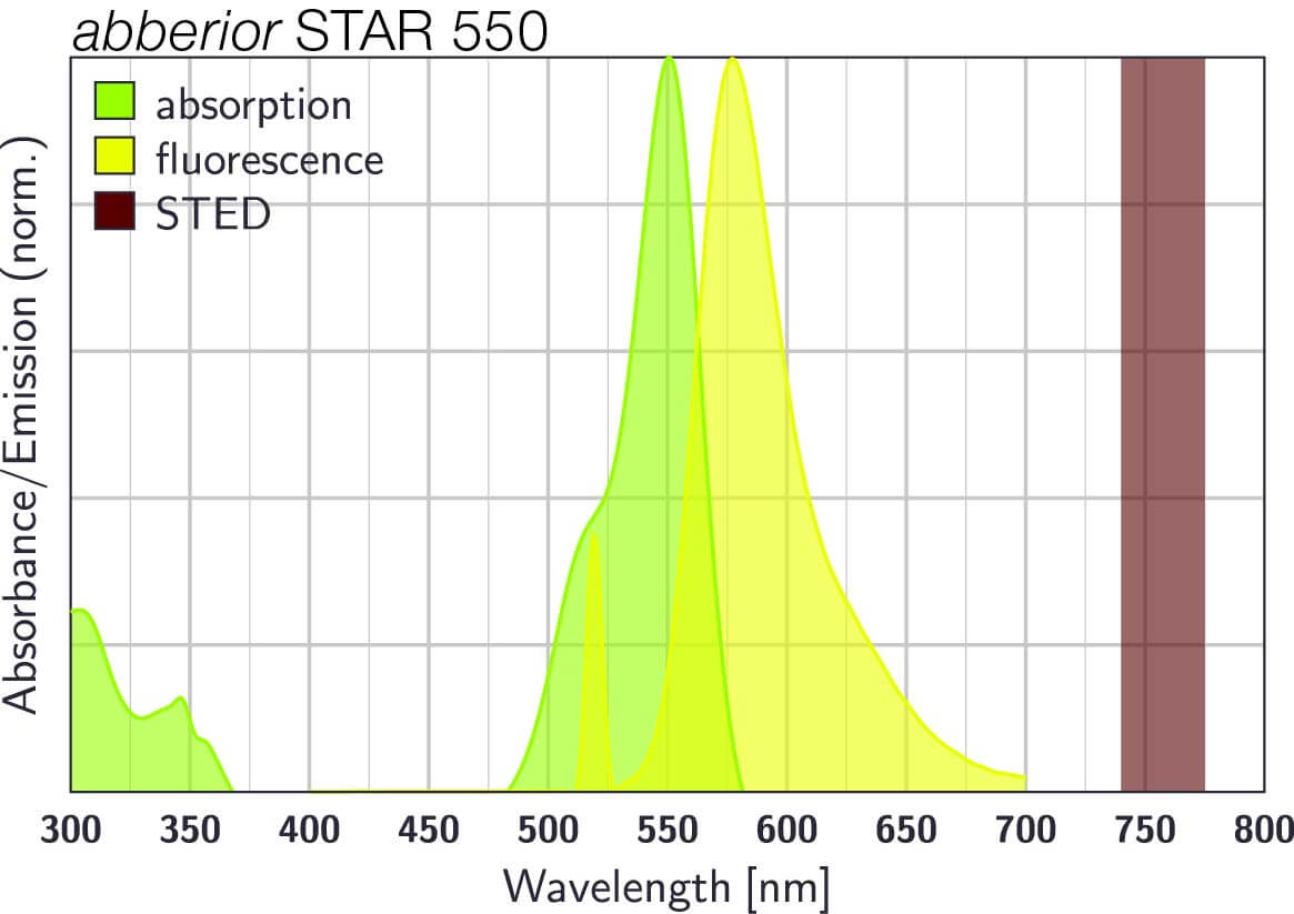 abberior STAR 550 was developed for STED and confocal microscopy in the green-orange spectral region. Characteristic features of this dye are its exceptional photostability and brightness. abberior STAR 550 can be very effectively excited effectively excited with a 561 nm laser. For STED microscopy, abberior STAR 550 can be used most efficiently with a STED laser wavelength between 650 – 775 nm. In combination with abberior STAR BLUE, abberior STAR ORANGE, and abberior STAR RED, abberior STAR 550 enables versatile 4-color imaging across a broad spectral range. Best results are obtained with freshly prepared samples.