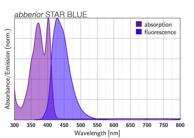 abberior STAR BLUE extends the abberior dye portfolio into the blue spectral range. It is designed for confocal microscopy and provides reliable performance with low background signal. abberior STAR BLUE can be excited with lasers in the 400–420 nm range and is a suitable replacement for dyes such as DyLight® 405. In combination with abberior STAR GREEN, abberior STAR ORANGE, and abberior STAR RED, abberior STAR BLUE enables versatile 4-color imaging across a broad spectral range. Best results are obtained with freshly prepared samples.