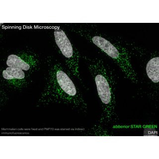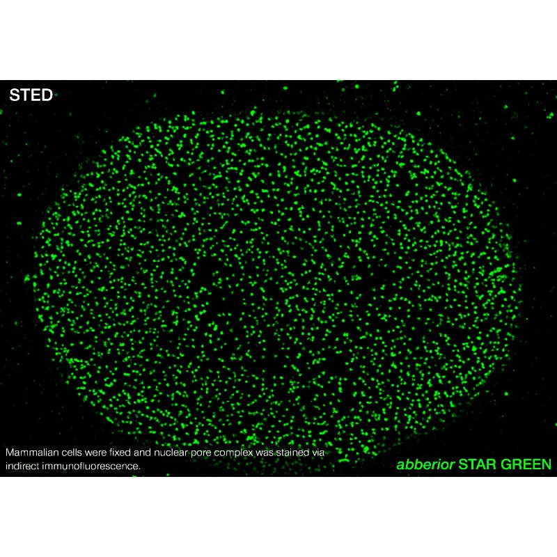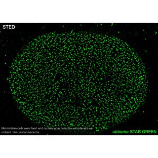 abberior STAR GREEN is a novel fluorescent dye belonging to the group of fluorescein dyes. Characteristic features of this dyes are bright green fluorescent with a fluorescent quantum yield of over 80% and exceptional photostability under STED and confocal imaging conditions. abberior STAR GREEN can be very effectively excited with the 488 nm laser line. For STED microscopy, this dye can be efficiently used with a STED laser wavelength between 590 – 610 nm. Our abberior STAR GREEN is the ideal partner for abberior STAR 440L to obtain optimal 2 color STED results with a single depletion laser. abberior STAR GREEN can substitute dyes like Oregon Green® 488, ATTO® 488 or Alexa Fluor® 488. Best results are obtained with freshly prepared samples.