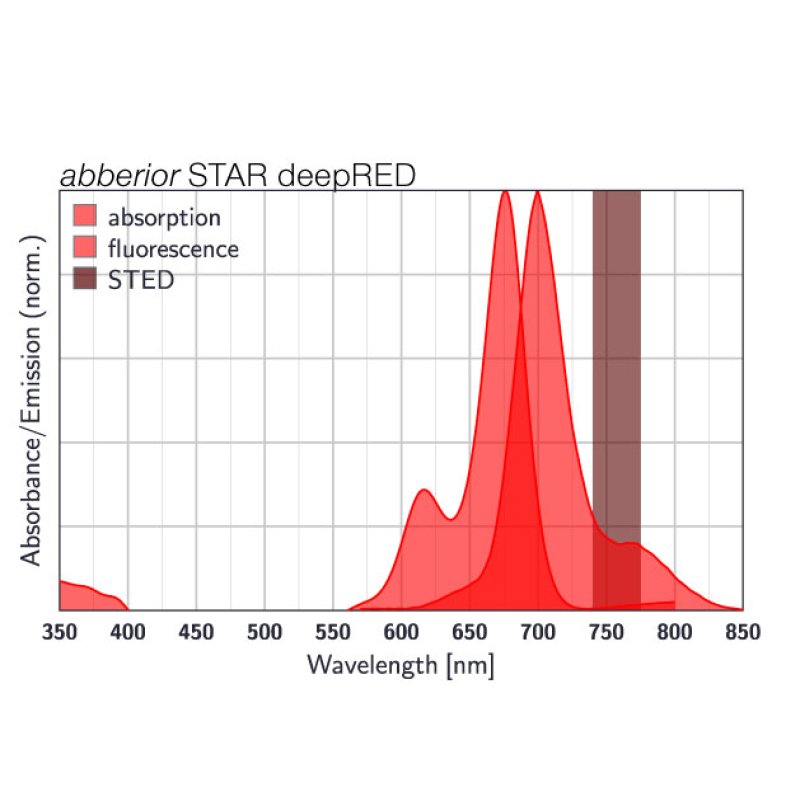 abberior STAR deepRED expands the abberior dye portfolio into the near-infrared (NIR) spectral range. Optimized for confocal and STED microscopy, it delivers bright fluorescence with minimal background signal and high photostability and is compatible with 775 nm STED depletion lasers. The dye can be efficiently excited with lasers around 680 nm and represents an excellent alternative to dyes such as CF680R, Alexa Fluor® 680, Cy®5.5, DyLight® 680, IRDye® 680LT, etc. Together with abberior STAR BLUE, GREEN, ORANGE, and RED, it enables flexible five-color imaging across a wide spectral range.